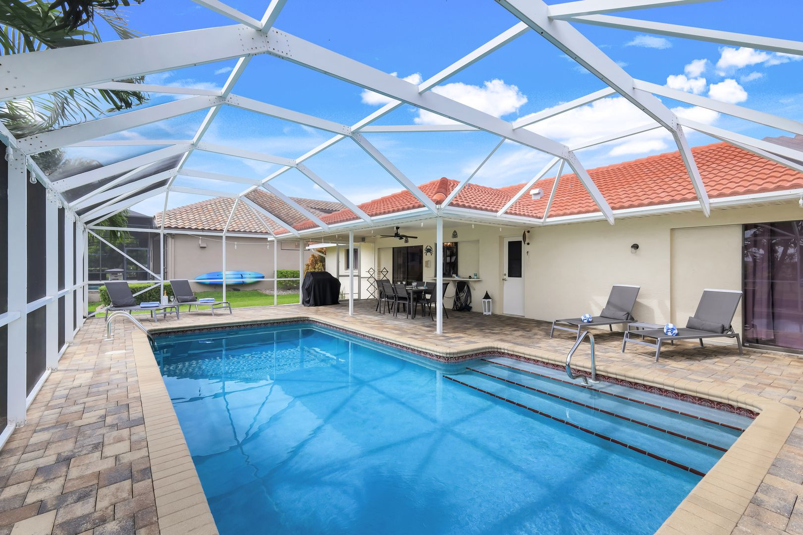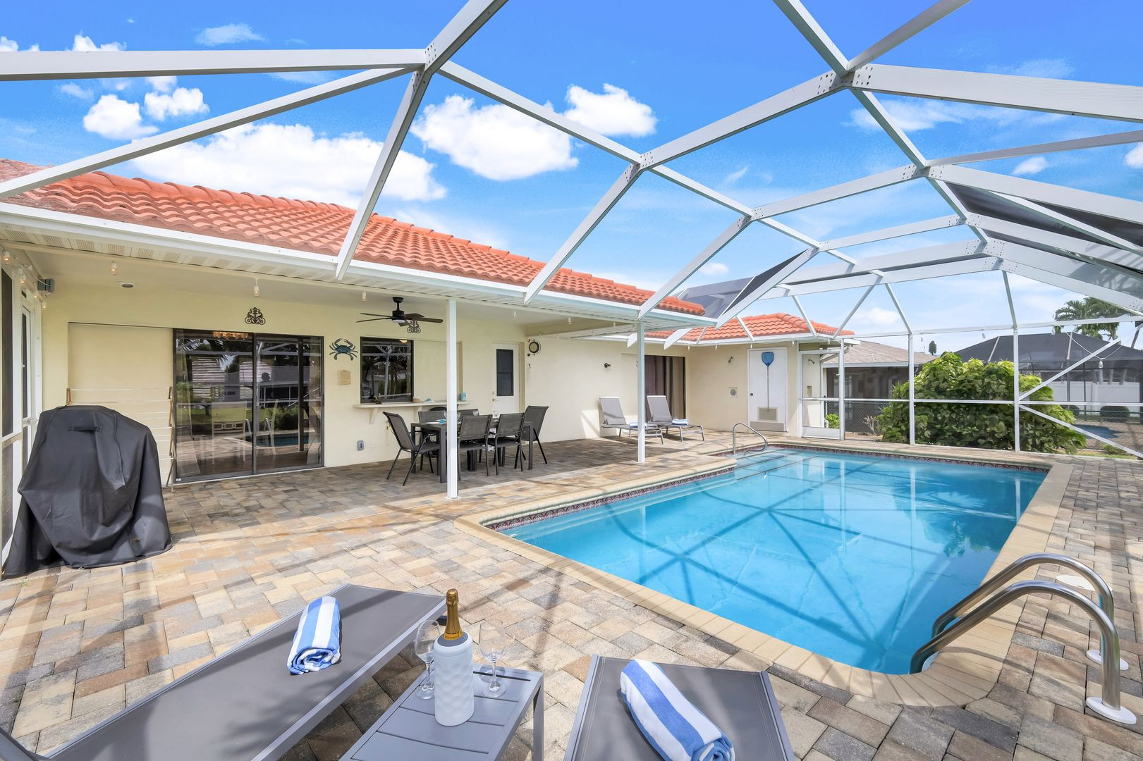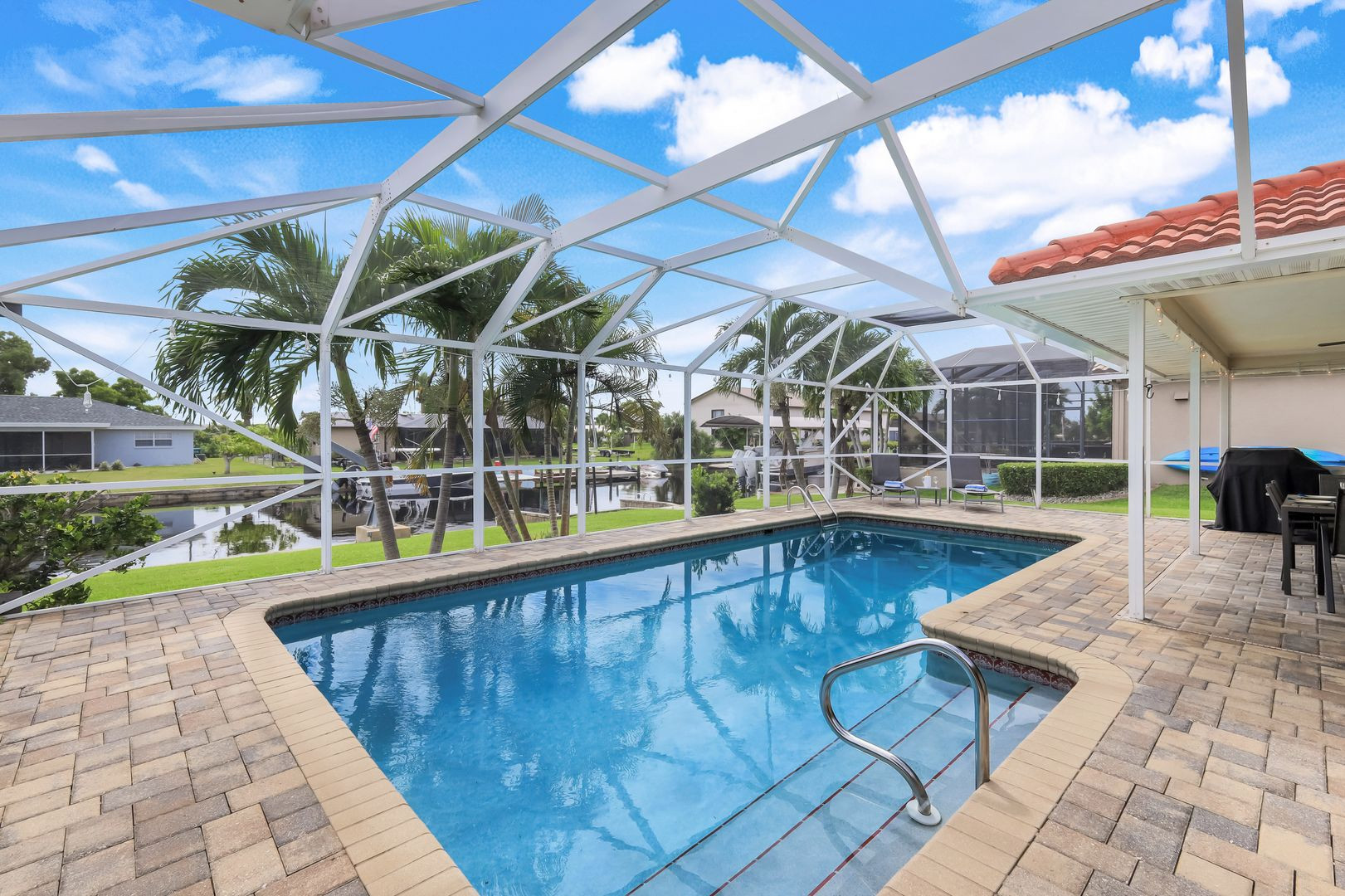 Ein einladendes Haus abseits des Wassers in einer begehrten Lage im Südwesten von Cape Coral, nahe Chiquita Blvd und Cape Coral Pkwy. Der großzügige Grundriss umfasst 3 Schlafzimmer (King-Size-Bett, Queen-Size-Bett, 2 Einzelbetten), 2,5 Badezimmer, ein separates Wohn- und Familienzimmer sowie eine große, voll ausgestattete Küche. Stilvolle Möbel verleihen dem Haus einen zeitgemäßen Touch. Der elektrisch beheizte Pool bietet ganzjährig Badespaß. Die nach Süden ausgerichtete Terrasse bietet einen Blick auf die üppige, tropische Landschaft. Geschäfte und Restaurants sind zu Fuß oder in kurzer Fahrzeit erreichbar.